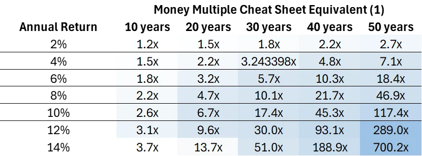 To solve this problem, let’s take a range of annual return figures – from 2% to 14% – and translate them on a “Cheat Sheet” into the equivalent of “multiples of money” earned on your investment over the appropriately longer periods of time that investors should be thinking about.